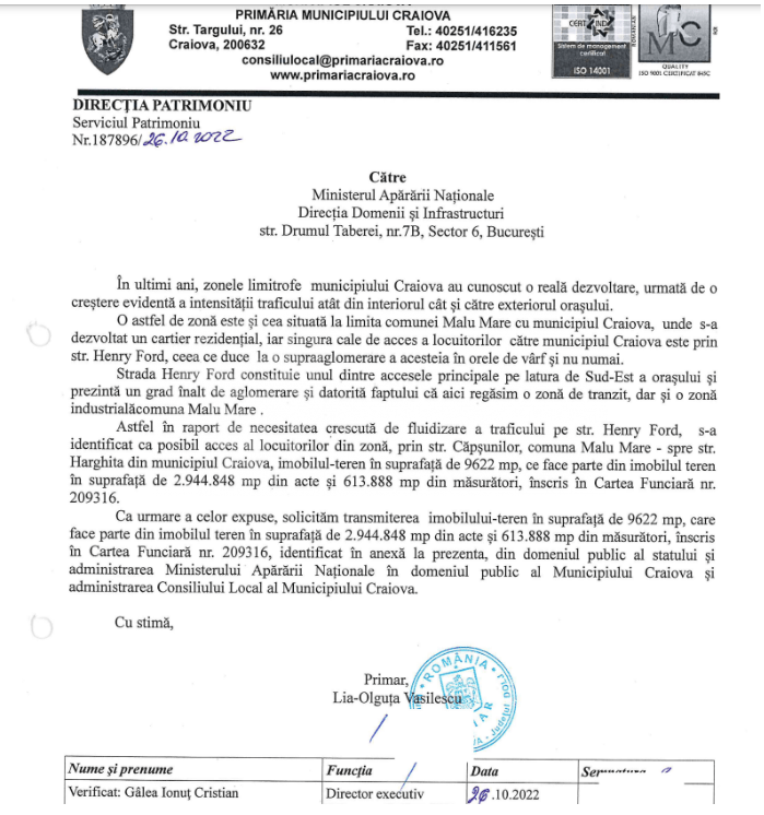 Solicitarea privind transmiterea terenului în suprafaţă de 9.622mp este justificată de necesitatea asigurării unui drum de acces din Str. Harghita către proprietăţile limitrofe imobilului 2810. Întrucât în această zonă s-a dezvoltat un cartier rezidenţial, iar singura cale de acces a locuitorilor către acesta este prin str. Henry Ford, pe această arteră a crescut în mod considerabil intensitatea traficului, conducând adesea la ambuteiaje. Astfel în raport de necesitatea fluidizării traficului pe str. Henry Ford s-a identificat posibilitatea accesului locuitorilor din zonă pe terenul în suprafaţă de 9622mp, folosit în prezent ca drum de acces, ce face parte din imobilul teren în suprafaţă de 2.944.488 mp din acte şi 613.888mp din măsurători aflat în proprietatea statului şi administrarea Ministerului Apărării Naţionale”, a motivat Direcția de Patrimoniu a Primăriei Craiova în Raportul întocmit pentru adoptarea de către Consiliul Local al Municipiului Craiova a proiectului de Hotărâre privind solicitarea transmiterii suprafeței (nr. 446/2023).